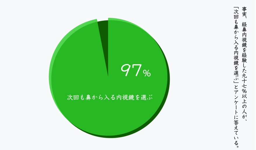 口より鼻が楽!当院でも口からと鼻からの両方の胃カメラを経験した方にアンケートした結果、9割以上の方が次回も鼻からの胃カメラを希望しています。